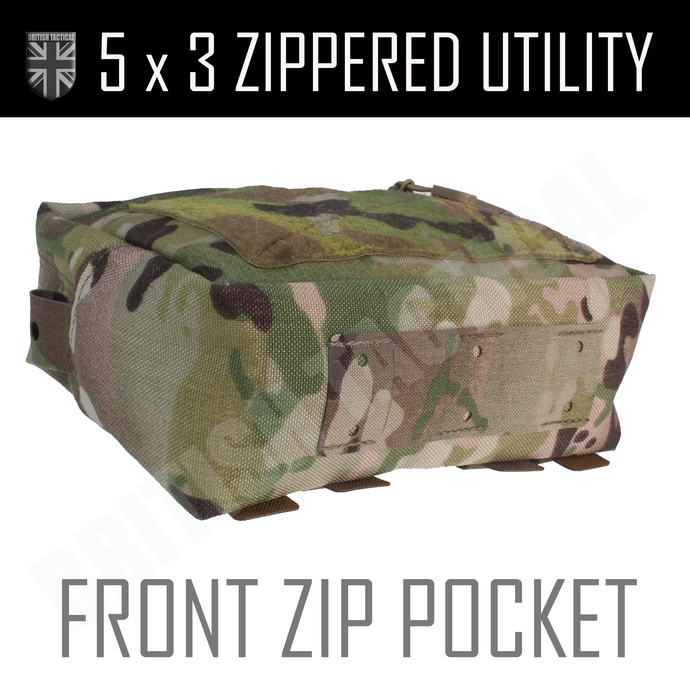 - NEW UPDATED Option - Front Zip Pocket. Front zip opening flat pocket with loop on the front, inside velour loop at the back with a flat pocket inside front, dummy tabs front and back. Laminate PALS grid on base.