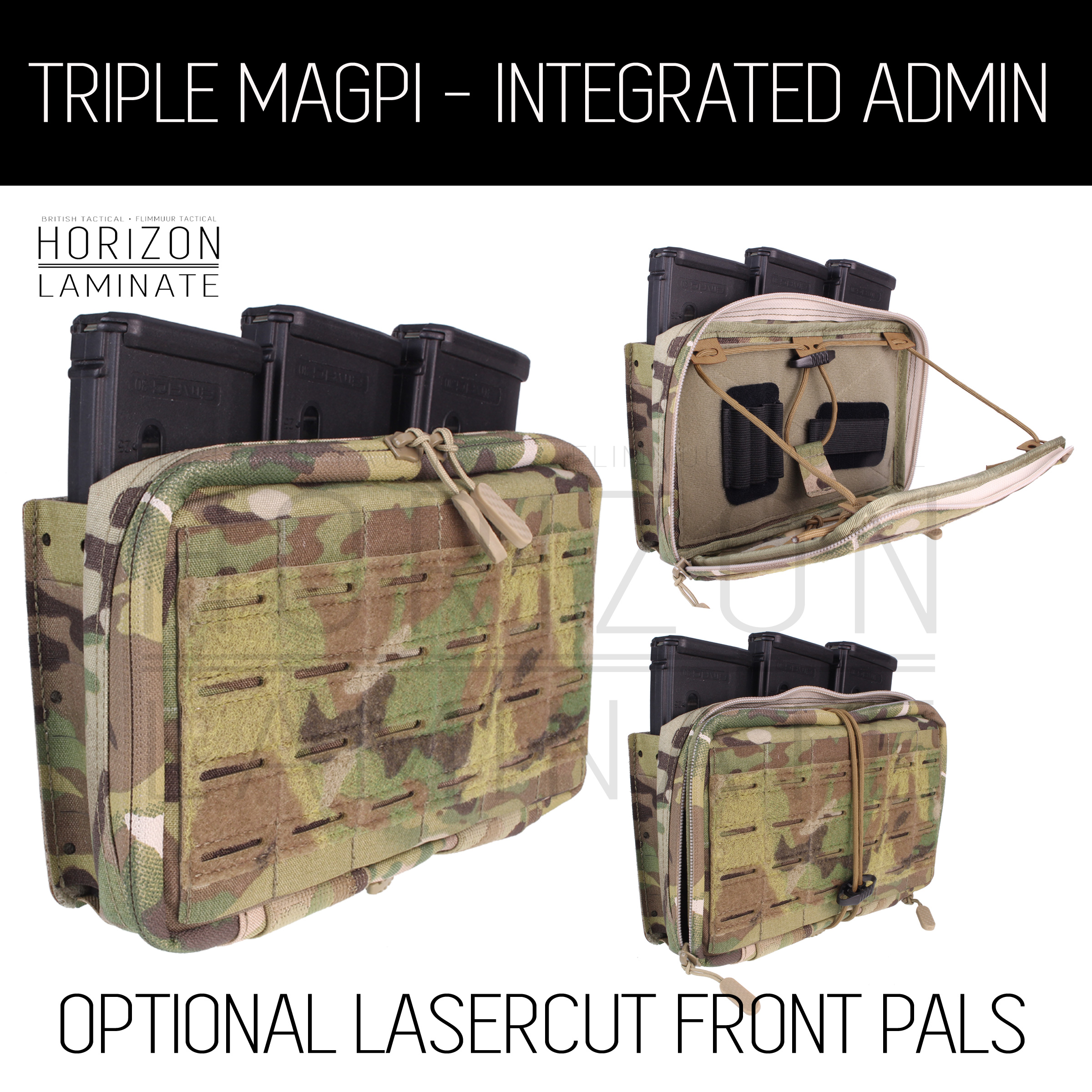 - Rear and mag sides/base constructed from Laser cut 500D/1000D Laminate Cordura. Front produced from combination of 500D and 1000D Multicam Cordura.