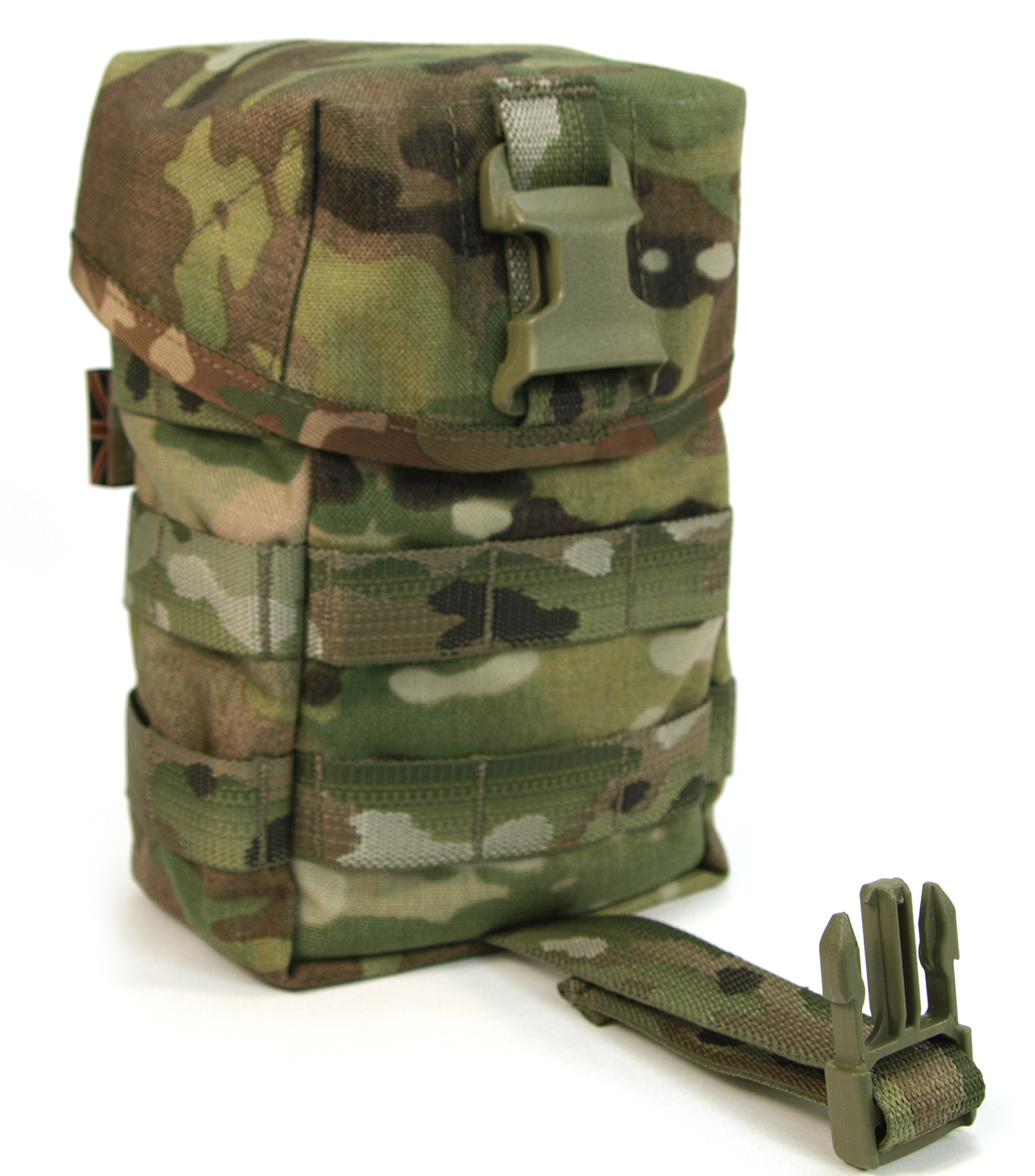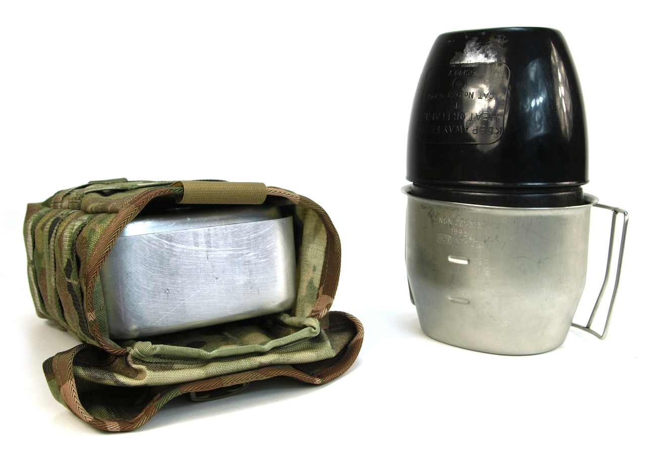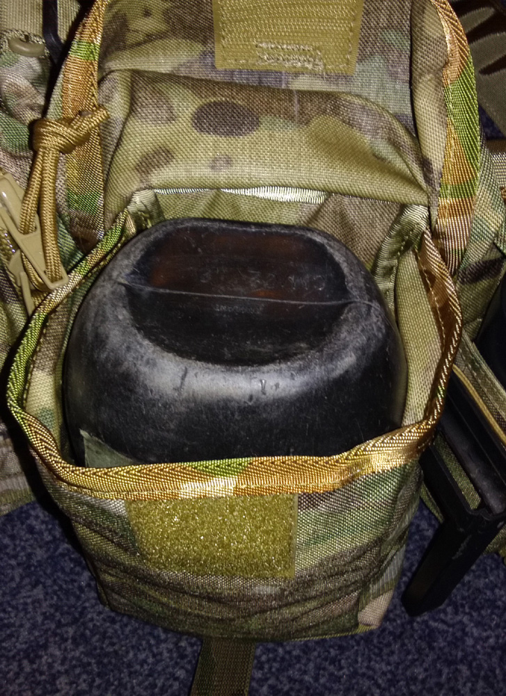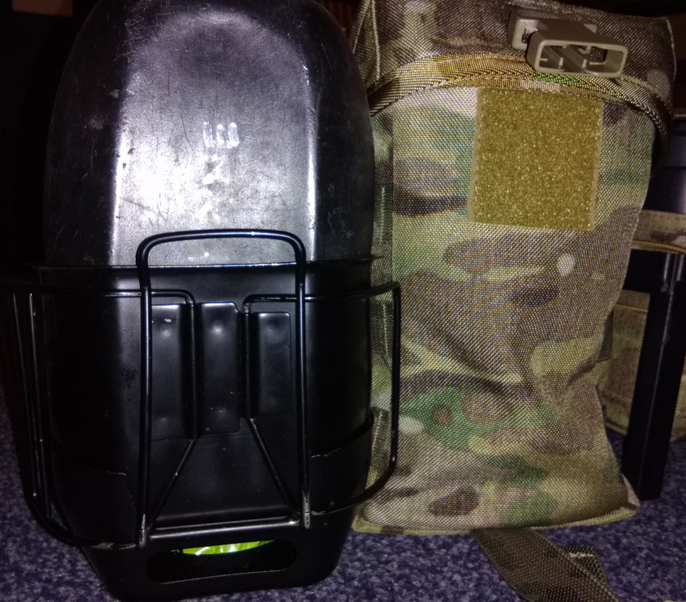 - Capable of holding Issue water bottle with metal and plastic cup, large mess tin, 1L Nalgene Bottle, Jet Boil, up to 6 x 5.56 magazines, 100 rounds of link.