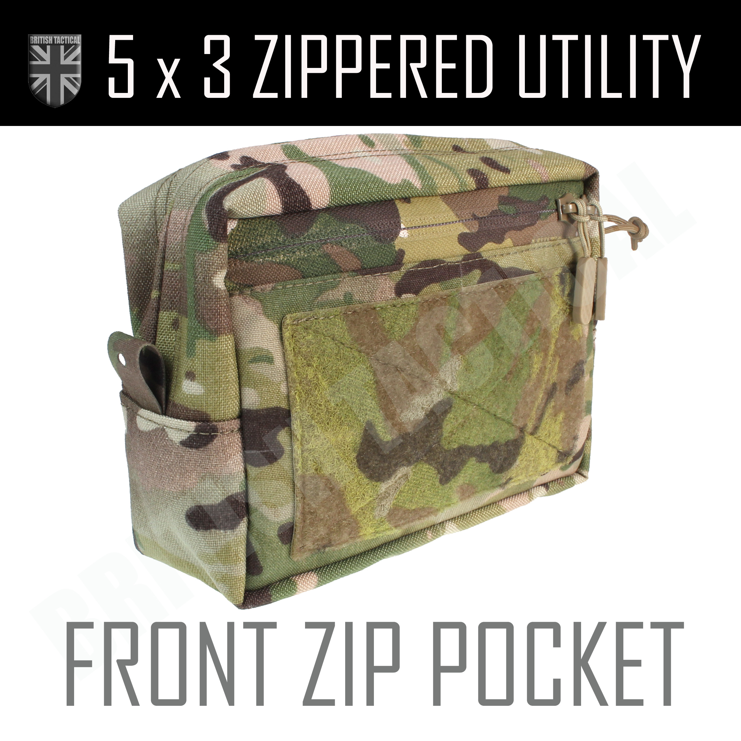 - NEW UPDATED Option - Front Zip Pocket. Front zip opening flat pocket with loop on the front, inside velour loop at the back with a flat pocket inside front, dummy tabs front and back. Laminate PALS grid on base.